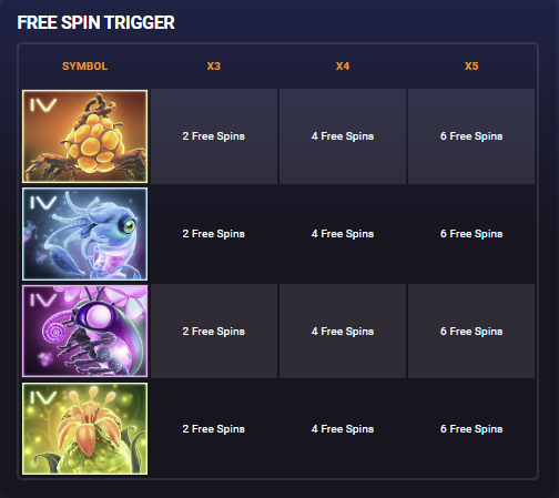 This triggers 2, 4 or 6 Free spins at 3, 4 or 5 symbols. The Evolving symbol that started the free spins becomes a Locked symbol. The Locked symbol will always appear fully evolved during free spins.